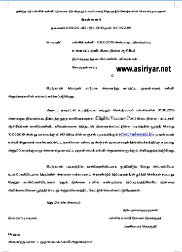 01.06.2019 நிலவரப்படி காலியாக உள்ள (நிரப்பத் தகுதி வாய்ந்த) இடைநிலை/பட்டதாரி ஆசிரியர் பணியிட விபரம் கோரி பள்ளிக் கல்வி இணை இயக்குநர் உத்தரவு - நாள்: 03.05.2019. BT & SGT Vacancy as on 01.06.2019