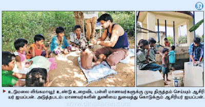 தமிழக அரசின் டாக்டர் ராதாகிருஷ்ணன் விருதுக்கு தேர்வு பெற்ற ஆசிரியர் ஐயப்பன், பழங்குடியின மாணவர்களுக்கு சிகை அலங்காரம் செய்வதோடு, துணி துவைத்து கொடுத்து அசத்தி வருகிறார்.திருப்பூர் மாவட்டம் உடுமலை ஒன்றியம் லிங்கமாவூர் கிராமத்தில், அரசு பழங்குடியினர் உண்டு உறைவிட பள்ளி உள்ளது. இங்கு ஆசிரியராக பணியாற்றும் ஐயப்பன் (36) என்பவருக்கு, தமிழக அரசு டாக்டர் ராதாகிருஷ்ணன் விருது அறிவித்துள்ளது.